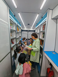 Durante a atividade, os alunos exploraram livros dentro da carrinha/biblioteca, mostrando grande curiosidade e entusiasmo ao folhear páginas e descobrir novas histórias.